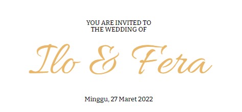 YOU ARE INVITED TOTHE WEDDING OF Ilo & Fera Minggu, 27 Maret 2022 Save The Date 00Hari 00Jam 00Menit 00Detik Couple Assalamu’alaikum warahmatullahi wabarakatuh Dengan memohon rahmat dan ridho Allah SWT, mohon do’a restu Bapak/Ibu/Saudara dalam rangka melangsungkan pernikahan putra putri kami : Ilham Eka Sarungkit, S.T Putra Pertama dari Bapak Agus M& Ibu Hj. […]