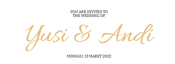 YOU ARE INVITED TOTHE WEDDING OF Yusi & Andi MINGGU, 13 MARET 2022 Save The Date 00Hari 00Jam 00Menit 00Detik Couple Assalamu’alaikum warahmatullahi wabarakatuh Dengan memohon rahmat dan ridho Allah SWT, mohon do’a restu Bapak/Ibu/Saudara dalam rangka melangsungkan pernikahan putra putri kami : Yusi Purwani, S.E Putri Bungsu dari Bapak Suwanto Slamet& Ibu Emi Yani […]